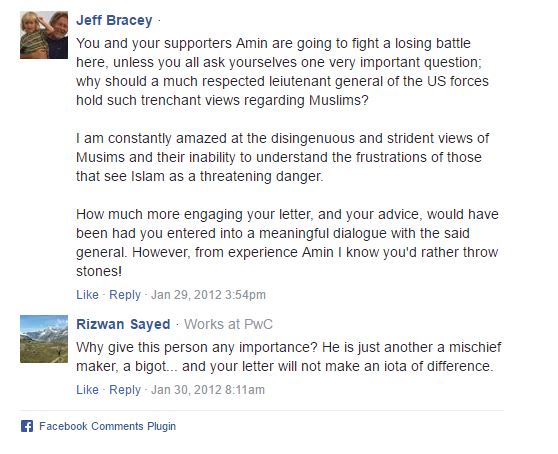 Regardless of how little he says during the prayer breakfast, the fact of him being honoured in this way will be seen by America’s enemies as an example of the US armed forces denigrating Islam. That is not in the American national interest, and also weakens the position of people such as myself who describe themselves as friends of the USA. These sentences focus on the harm to the USA, not on any upset to me or the American Muslim community. (You can read my published views on 9/11 at https://www.mohammedamin.com/Community_issues/Reflections-on-9-11.html ) This sentence provides a concrete example of my claim to be a friend of the USA. While I do not expect the prayer breakfast to receive much mainstream media coverage, Written to anticipate any argument that this matter is "a storm in a teacup." you can be confident that America’s enemies will do everything possible to spread the fact of his having spoken there, and to spread any anti-Muslim comments he might make as further evidence that “America is at war with Islam”, something that President Bush and President Obama have taken great pains to disavow. The reference to President Bush is important because many Americans se President Obama as being "pro-Muslim." His participation is directly contrary to the USA’s public diplomacy interests. Another reiteration of the harm to the USA.